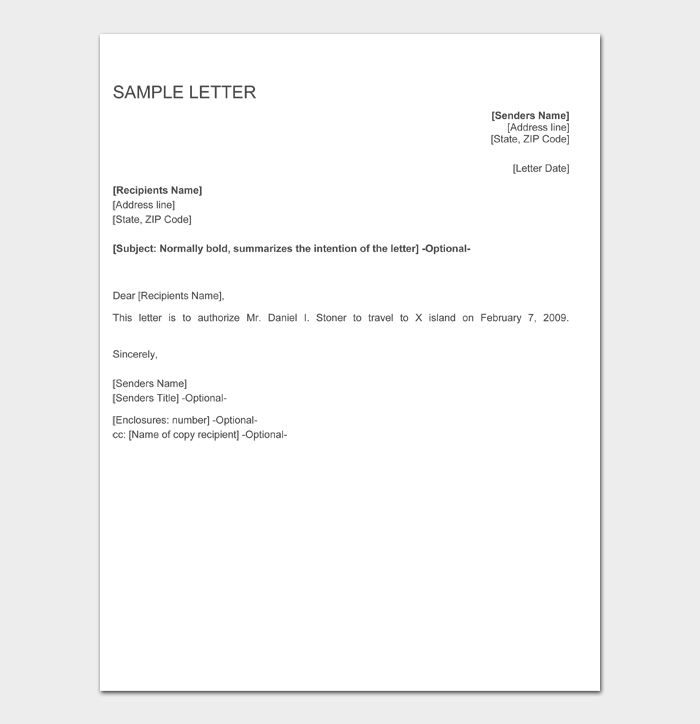 An authorization letter is a written proof of permission, in a letter format, that the recipient is liable to perform the listed actions they are authorized to, if they are carrying the authorization letter. 06.10.2018 · authority letter has become an essential part of our daily business communications. In many occasions in your life you are needed to write an authority letter for someone to allow him/her some authority on your behalf. It is commonly used in situations where the authorizing party currently is or perceives a future where they might be unable to perform the action themselves. In other words, it is a formal official letter that confirms a person's authority … An authorization letter is a legal document that allows an individual to give someone the ability to act on your behalf. A letter of authorization is a letter given to the recipient as a proof that he/she is liable to perform an action on someone else's behalf. A good example of an authorization letter is a direction to grant permission for performing a particular task. This form of letter … A travel letter of authorization is one of the types of authorization letters that are written by people who wish to give authority to someone else. My/our passport details are as follows: In a travel letter of authorization, the letter must address the higher authority of the travel department of the respective airline. An authorization letter is a written document that gives another person rank, ability, or authority to perform an action, make a decision, or enter a legal contract on behalf of another person.